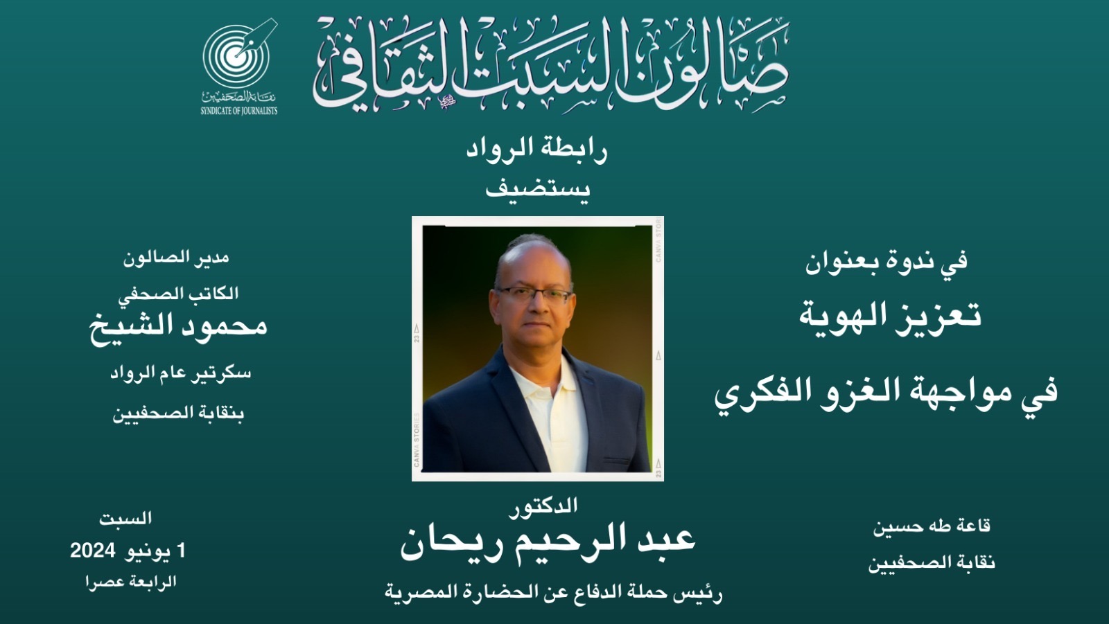 القاهرة-خاص في إطار الهدف الرئيسى للصالون بالحفاظ على الهوية المصرية من الغزو الخارجي لها .. وفى إطار هذه السلسلة التي بدأها صالون السبت الثقافي التابع لرابطة الرواد بنقابة الصحفيين وأستضاف فيها العديد من الخيراء والمتخصصين في الرد على هذه الدعاوى لتهميش الهوية والحضارة المصرية وإندارثا . يستصيف صالون السبت الثقافي المفكر والخبير الآثرى القدير الدكتور عبد الرحيم ريحان ، رئيس حملة الدفاع عن الحضارة المصرية ، عضو لجنة التاريخ والآثار المجلس الأعلى للثقافة ، مدير المكتب الإعلامى لمجلس الآثاريين العرب ، في الساعة الرابعة بعد ظهر وحتى السادسة مساء يوم السبت الموافق الموافق الأول من يونيو 2024 لبفتح صحفة جديدة من صفحات النضال الفكرى تحت عنوان " تعزيز الهوية فى مواجهة الغزو الفكرى " ويدير الصالون الكاتب الصحفى والفنان محمود الشيخ ، ويحاور الضيف الكاتب الصحفى سعيد جمال الدين سرحان . وتدور محاور الندوة • الهوية وذاكرة المكان والزمان، والإطار المعرفى للهوية • التاريخ المصرى مصدرًا من مصادر الهوية بكل مفرداته منذ عصور ما قبل التاريخ مرورًا بعصر مصر القديمة إلى البطلمى فالرومانى إلى المسيحى ثم الإسلامى حتى التاريخ الحديث والمعاصر • المسارات الدينية، مسار نبى الله موسى ومسار العائلة المقدسة ومسار آل البيت • التعددية الثقافية وكيفية الحفاظ عليها • الاحتفاليات الدينية المسيحية والإسلامية والموالد والترانيم والأعياد • المنتجات التراثية المتنوعة • التواصل الحضارى فى اللغة والعادات والتقاليد • كيفية تعزيز الهوية ويؤكد الدكتور عبد الرحيم ريحان ، أن الدستور المصرى في نص مادته رقم 50 قد أكد على التأكيد على الهوية المصرية والعمل على تعزيزها وذلك وفقاً للنص التالى ""إلتزام الدولة بالحفاظ علي الهوية الثقافية المصرية بروافدها الحضارية المتنوعة ونصها "تراث مصر الحضاري والثقافي، المادي منه والمعنوي بجميع تنوعاته ومراحله الكبري، المصرية القديمة والقبطية والاسلامية ثروة قومية وإنسانية تلتزم الدولة بالحفاظ عليه وصيانته، وكذلك الرصيد الثقافي المعاصر المعماري والأدبي والفني بمختلف تنوعاته، والاعتداء علي أي من ذلك جريمة يعاقب عليها القانون وتولي الدولة اهتمامًا خاصًا بالحفاظ علي مكونات التعددية الثقافية في مصر" جدير بالذكر أن الدكتور عبد الرحيم ريحان ، يحمل على عاتقه وعدد من الخبراء الآثريين ، محاولات إنقاذ الآثار المصرية وتوثيقها وتسجيلها حيث قام بأعمال مسح أثرى بمعظم مناطق سيناء وأشرف على ترميم النقطة العسكرية المتقدمة بنويبع وقام بتسجيل تل المشربة بدهب فى عداد الآثار الإسلامية متحديًا التهديات والإغراءات من أهل المنطقة حيث بلغ سعر الأرض الأثرية وقت تسجيلها عام 2007 عشرون مليون جنيه، ورفض رشوة مليون جنيه فى مقابل عدم تسجيل الأرض فى عداد الآثار كما قام بعمل قاعدة معلومات موثقة علميًا لآثار سيناء والوجه البحرى وتسجيل 43 أيقونة من أيقونات دير سانت كاترين كرئيس للجنة تسجيل مقتنيات دير سانت كاترين ومراجعة علمية وتوثيق لعدد 1000 أيقونة ومقتنى من مقتنيات دير سانت كاترين ,تقدم رسميًا بمذكرات علمية قانونية بشأن طلب استرداد مخطوطات دير سانت كاترين ومنها أقدم مخطوط للتوراة فى العالم وهى التوراة اليونانية الذى يعود إلى القرن الرابع الميلادى من المتحف البريطانى وجامعة ليبزج بألمانيا وكذلك العهدة النبوية الخاصة بدير سانت كاترين الموجودة بتركيا والتقدم بمشروع علمى متكامل لتطوير المواقع الأثرية بطور سيناء وتل المشربة بدهب