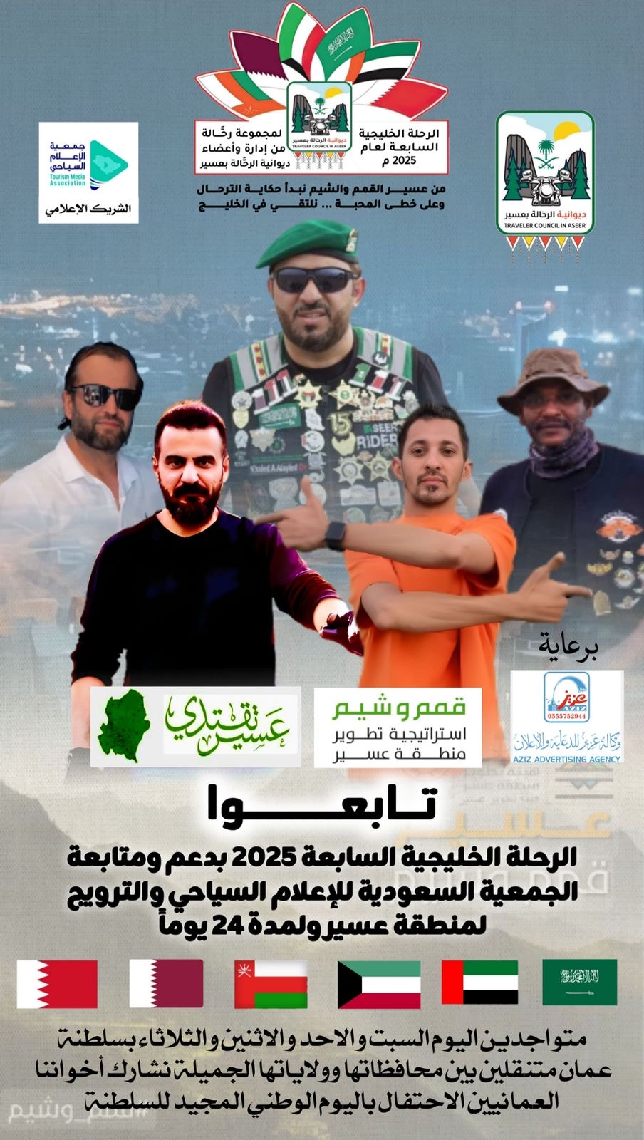 وبعد اختتام برنامجهم في الرياض، اتجه المشاركون إلى سلطنة عُمان عبر منفذ البريمي، ووصلوا إلى محافظة البريمي في طريقهم إلى صلالة ضمن مسار الرحلة. وكان في استقبال الوفد الدكتور سلطان اليحيائي الذي رحّب بهم وثمّن جهود مجموعة رحّالة في تعزيز الحراك السياحي والإعلامي الخليجي المشترك. وقد قدم المشاركون درعًا تذكاريًا للدكتور اليحيائي تقديرًا لدعمه ومساندته لمثل هذه المبادرات النوعية. وضم وفد الرحلة نخبة من الرحّالة والإعلاميين الخليجيين، وفي مقدمتهم: الرحّال الجنوبي خالد علي العايض، قائد الرحلة، ومؤسس والرئيس التنفيذي لديوانية الرحالة بعسير، والكابتن عايض بن شايع القحطاني، والكابتن أحمد حمزة الحقوي، والكابتن علي بن هجّاد الغامدي، والكابتن علي بن جبران الجندلي. وتمتد الرحلة 24 يومًا داخل وخارج المملكة يتنقل فيها المشاركون بين مناطق المملكة وعدد من دول الخليج، بهدف الترويج للسياحة في منطقة عسير وإبراز مبادراتها التنموية مثل استراتيجية قمم وشيَم ومبادرة عسير تقتدي إلى جانب التعريف بالمقومات السياحية للدول الخليجية المشاركة. وتهدف الرحلة إلى توثيق التعاون بين الرحّالة والإعلاميين الخليجيين، وإنتاج محتوى يعكس التنوع التراثي والبيئي والثقافي في المنطقة، بما يعزز من تكامل الجهود الخليجية في القطاعين السياحي والإعلامي.