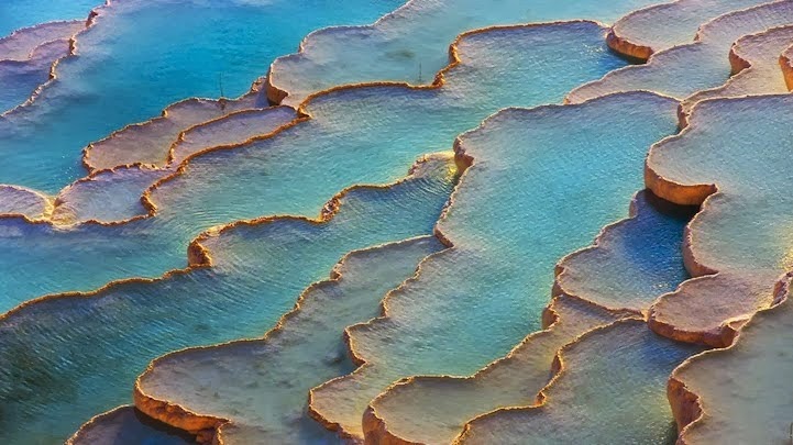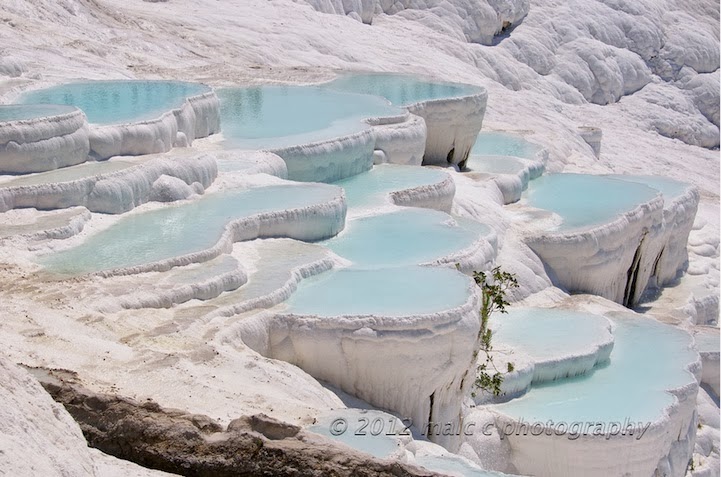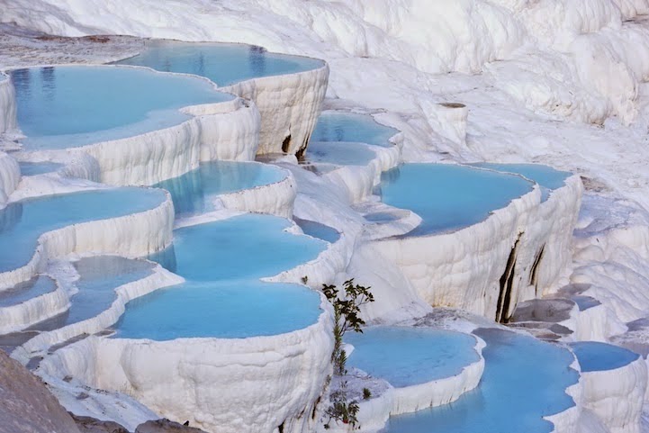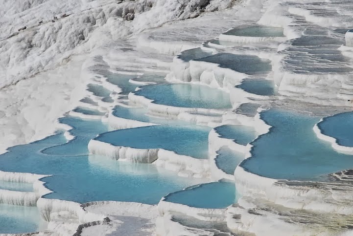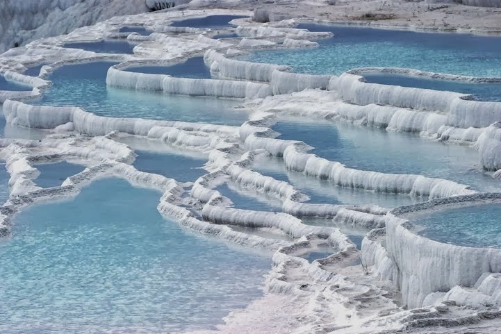تعد ينابيع باموكالي الدافئة في تركيا، التي تظهر على شكل مدرجات باللون الأبيض من أشهر المزارات السياحية في البلاد، وقد تشكلت هذه المدرجات الجيرية عبر ملايين السنين، لكنها تعرضت لعبث الإنسان في فترات سابقة، وهو ما أفقدها بريقها الأبيض الناصع.