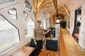 وفي داخل القطار تم تجهيز غرف فندقية وقاعات طعام على مستوى عالي من الفخامة والرفاهية، ومفروشات ذهبية ومأكولات معدة لاستقبال الركاب، إضافة إلى أواني ومعدات جاهزة للاستعمال الآدمي الفوري.
