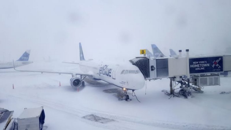 ونقلت "بلومبرج" عن الهيئة الوطنية الأمريكية للطقس أن العاصفة العابرة للقارات، التي تسببت في هطول ثلوج وهبوب رياح عاتية على سهول الغرب والشمال الأمريكي، قد وصلت إلى نيويورك، وقد أصدرت سلطات الطيران بمطار جون كيندي بنيويورك تنبيهًا مرتفعًا للمسافرين والقادمين إلى المدينة خلال هذا الأسبوع، بمراجعة الحجوازات؛ حتى لا يتم خسارة قيمة التذاكر.