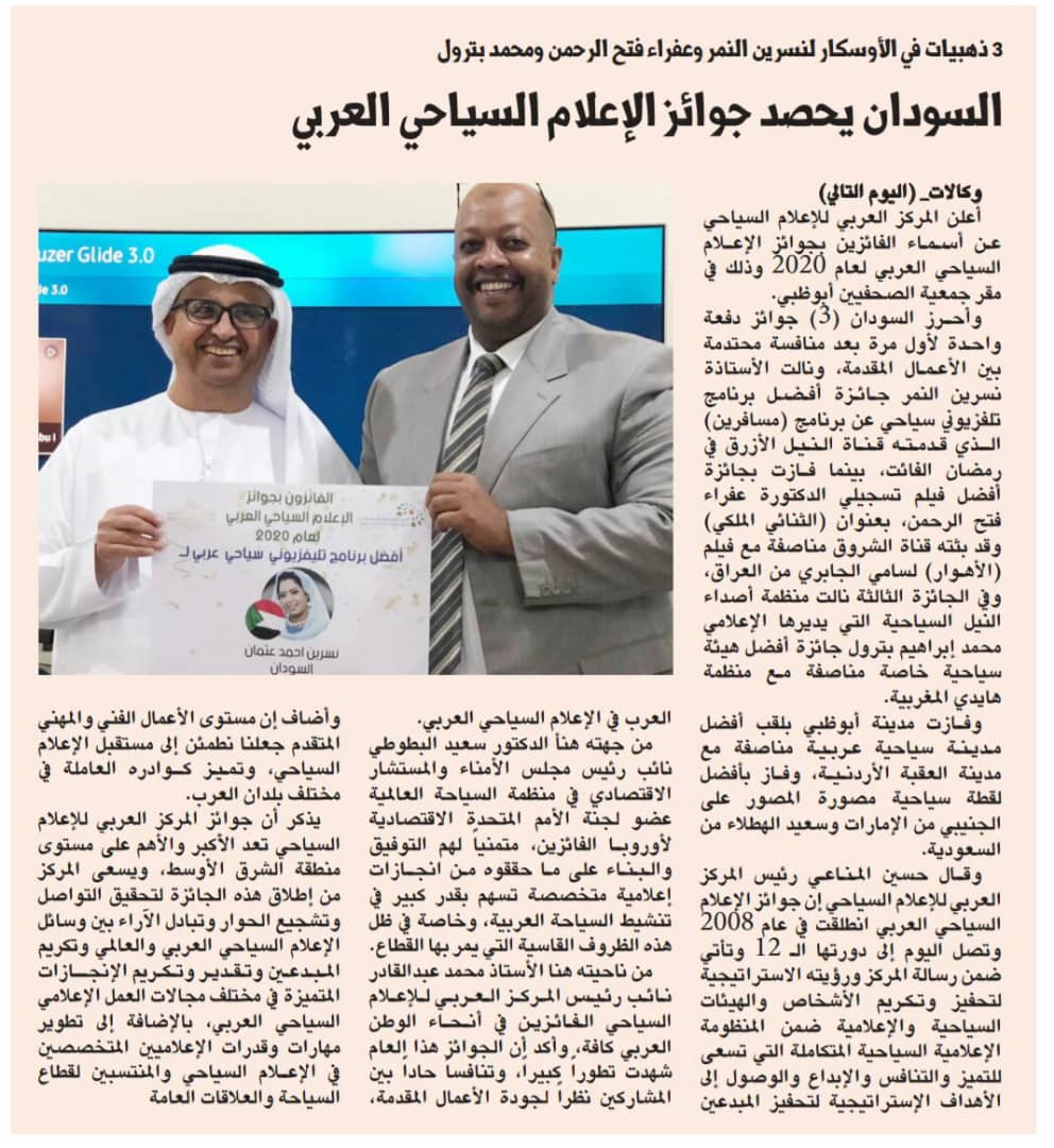 الصحيفة اليوم التالي : السودان يحصد جوائز الاعلام السياحى