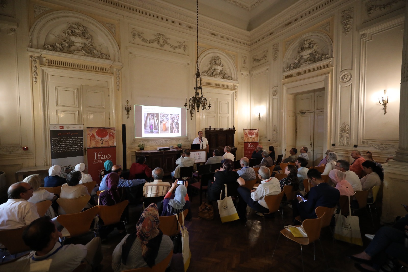 وقد رحب بيار تاليه، مدير المعهد الفرنسي للآثار الشرقية، بتنظيم هذا اليوم والحضور، بينما إستعرض عباس زواش ، مدير الدراسات في المعهد ، تاريخ المعهد الفرنسي للآثار الشرقية ، وقدمت فلورنس ألبير، المديرة التنفيذية لقسم التحرير في المعهد،عرضاً لآثار إسنا ، وسيدريك لارشيه، مدير قسم الأرشيف والمجموعات الخاصة.